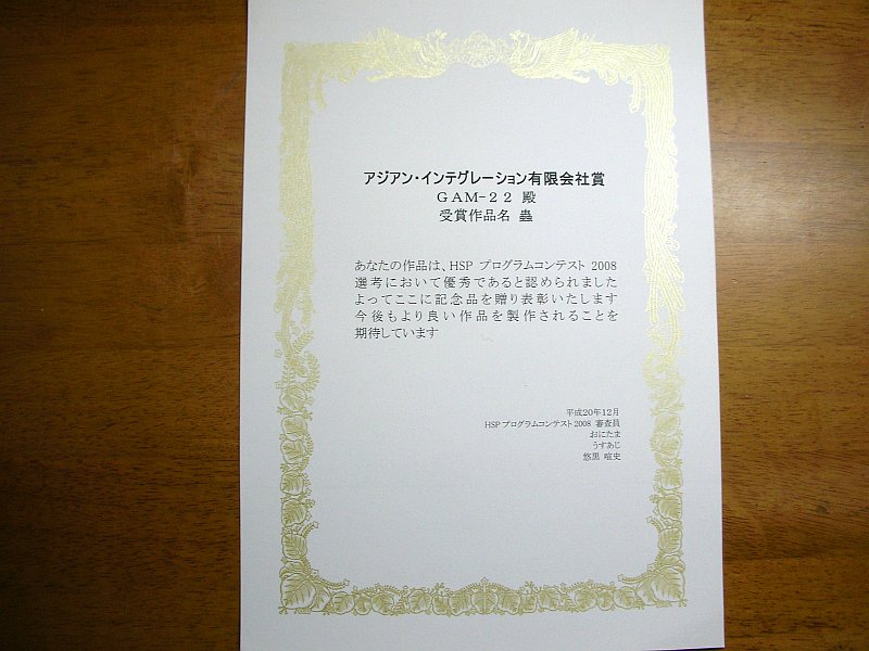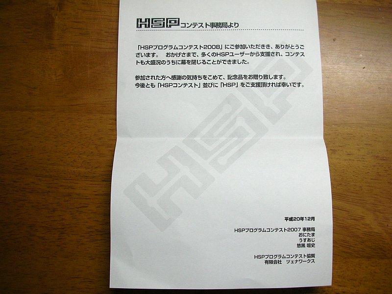 コンテスト入賞から約1ヶ月経ちましたが、HSPプログラムコンテスト2008の賞品と参加賞が届きました。