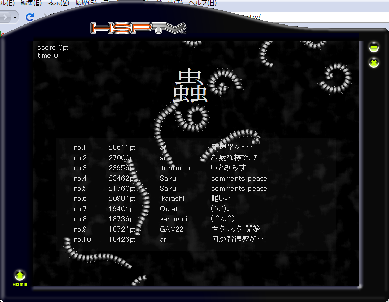 なんとまた技術を評価していただきました。倫理観を揺さぶられる。そっ、そうでしたか!! 気分を悪くしてしまったのなら、申し訳ないです。しかし、蟲の動きはなるべくリアルにしようと意気込んでいたので、本当に嬉しいコメントです。ありさんですが、HSPTVの方で、28611ptという、相当頑張らないと取れない得点を取るまで触っていただきました。色々とありがとうございます。