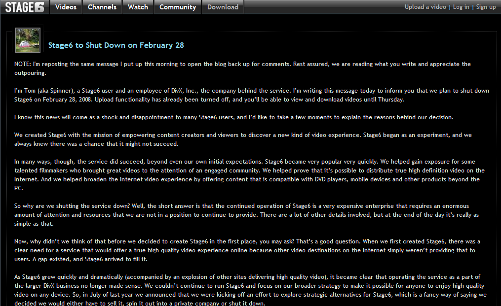 どうやら、動画共有サイト、stage6は2月28日をもって、閉鎖ということらしいです。