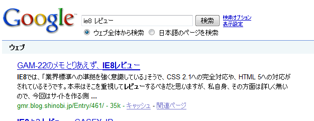 また「ie8 レビュー」でGoogle検索すると、このブログの記事がトップにヒットします。