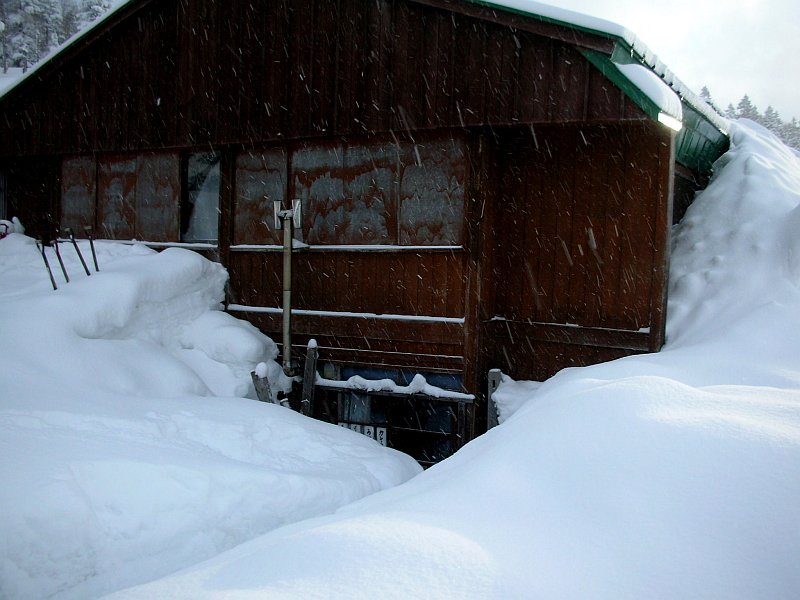 泊まったのはこの小屋です。どうやら、夏には定食屋として営業しているようでしたが、冬はこの有様。2階建のハズなのに、1階は完全に雪の下に埋もれ、穴を掘って中に入りました。因みに、今年はこれでも雪が少なめで、年によっては屋根も見えなくなるそうです。
