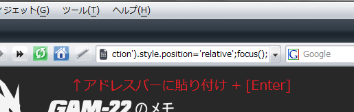 アドレスバーの文字を消去して、javascript:document.getElementById('NINCtDrawSection').style.position='relative';focus();を貼り付け + [Enter]です。